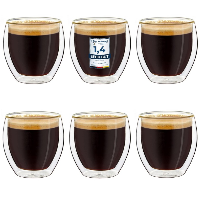 - Offer: 6 x 100 ml double-walled espresso glass or espresso glasses, high-quality borosilicate glass, which keeps hot drinks warm for longer and cold drinks cold longer. In addition, the double wall glass ensures an always evenly tempered outer glass, so that even possible burning of the fingers is a thing of the past.
