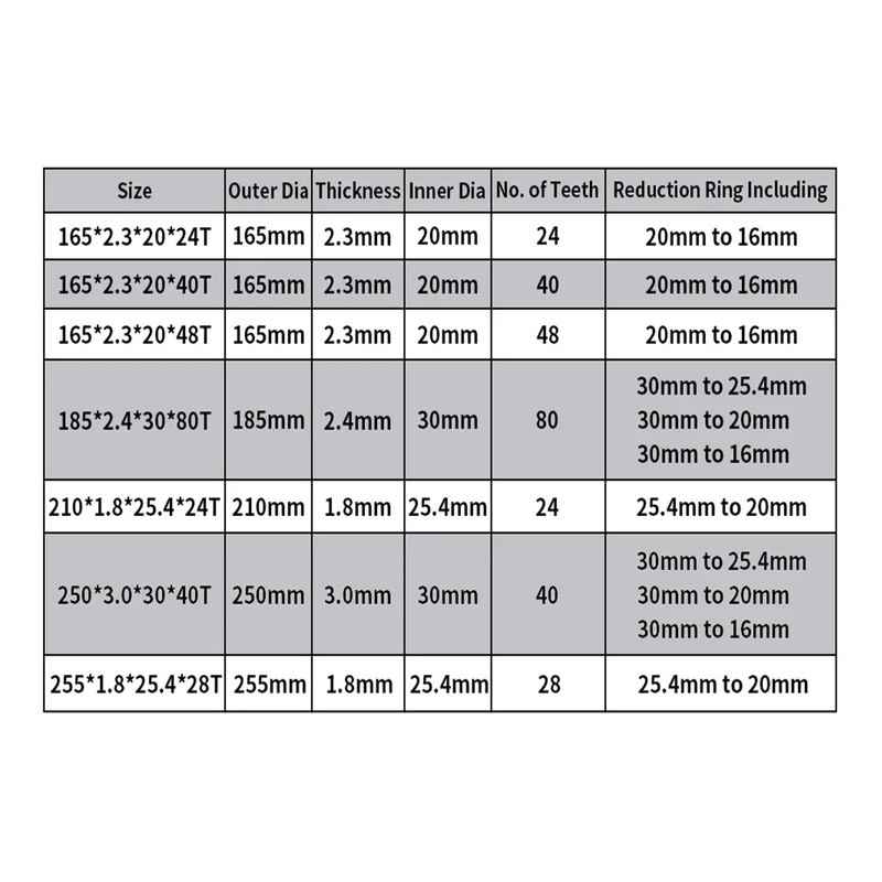 - -Outer Diameter: 165/185/210/250/255mm