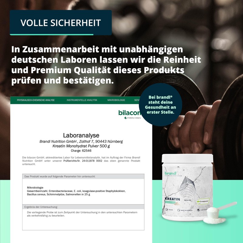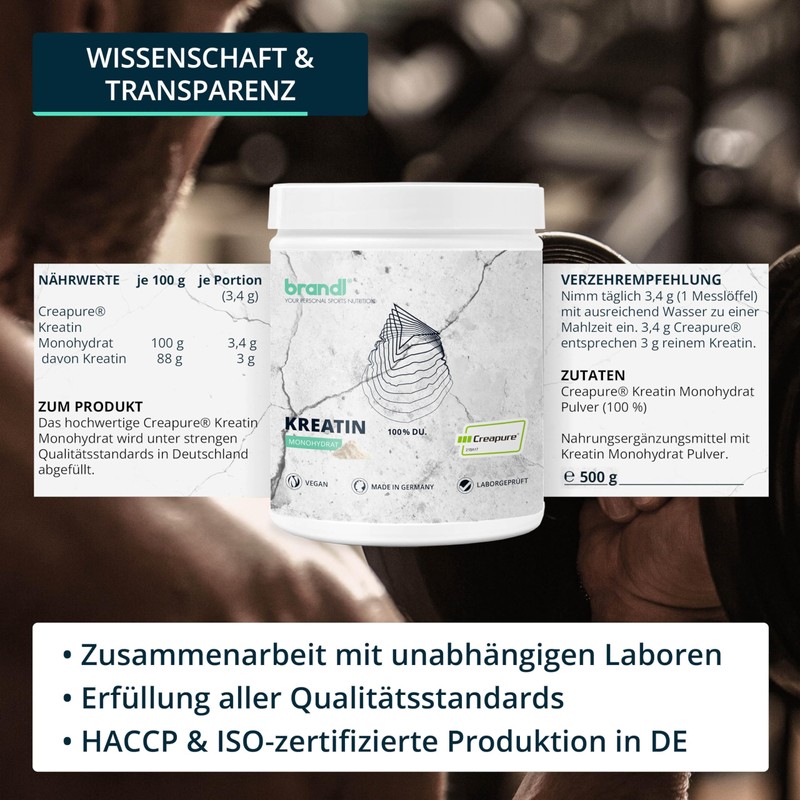 - ✔️ Out of love for the body - brandl Nutrition has an internal product development (including nutrition technologists) that reads hundreds of clinical studies to develop scientific products based on them. Among other things, many professional athletes and Olympic participants use this creatine monohydrate powder.