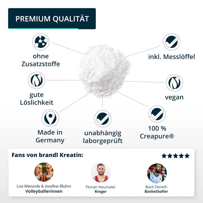 - ✔️ 100% Creapure – The world's popular premium creatine monohydrate made in Germany by Creapure in collaboration with brandl, the premium brand for sports nutrition.