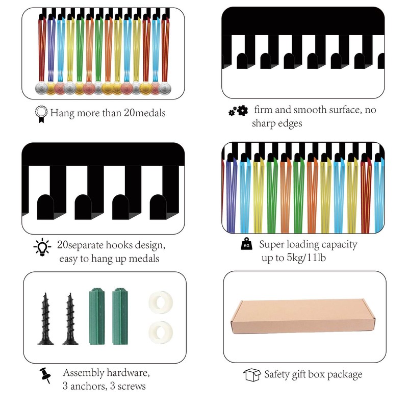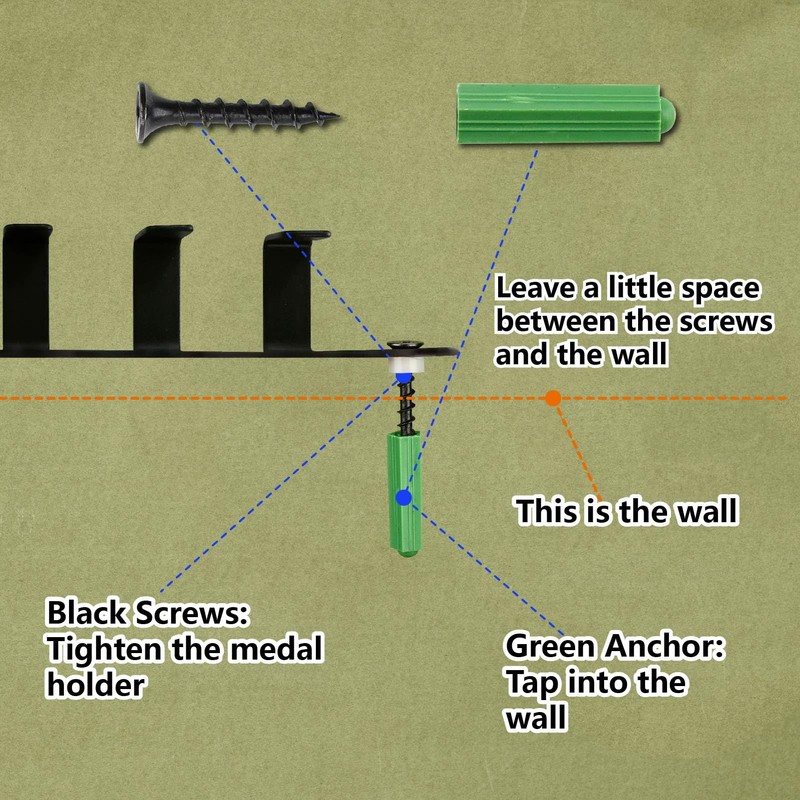 - [MEDALS HANGER DISPLAY SIZE]: The medal display rack size: 11.4 x 5.1inch(29 x 13cm), thickness: 1.5mm, hole diameter: 5mm. 1pc x metal holder, 2pcs x screws, 2pcs x anchors, 1pc x package box.
