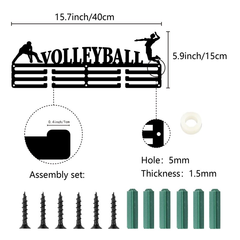 CREATCABIN Volleyball Medal Hanger Sports Medal Holder Display Award Lanyard Ribbons Organizer Metal Black Rack Mounted for Wall Hanging 60+ Medals Sport Race Gifts Soccer Players Athletes CompetitionBrand: CREATCABINAbout our product :Color : BlackMaterial : IronSize : 15.7 x 5.9 inch(40 x 15cm)Hole : About 5mm, thickness: 1.5mmFeatures:1. Our medal hangers is made of high-quality solid iron, durable and sturdy, can hold 60+ medals.2. Great decoration to your home, to any player or athlete's office, living room, or bedroom.3. A perfect gifts for yourself and your family, friends.Installation Notes:1.Make the screw locations with a pencil2.Use a power dill(5mm drill bit) to make holes for the wall anchors3.Tap the wall anchor gently to the wall4.Put the hook in place and tighten the screws