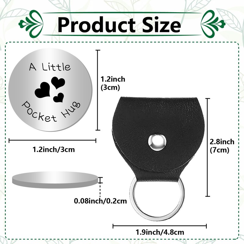- [POCKET HUG TOKEN KEYCHAIN SIZE]: Pocket hug token: 30 x 30 x 2 mm/ 1.2 x 1.2 x 0.08 inch, PU leather key chain: 50 x 70 mm/ 1.9 x 2.8 inch. Pocket Hug tokens can easily fit into your pocket, bag, or purse, making them easy to carry and view.
