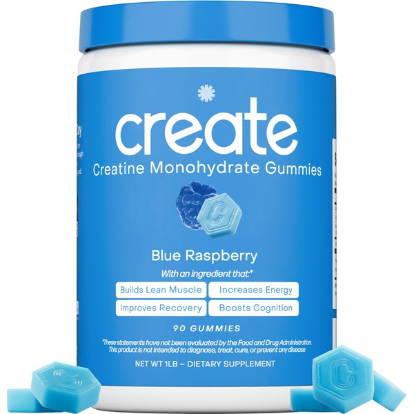 Create Creatine Monohydrate Gummies for Men & Women, Boost Focus, Strength, and Endurance, Anti-Melting Formula, Vegan, Gluten-Free, Non-GMO, 1.5g of Creatine per Gummy (Blue Raspberry, 90 ct)