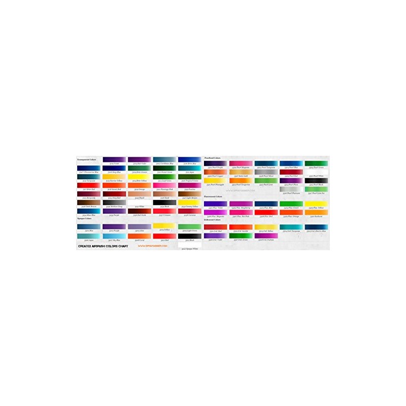 Createx Airbrush Transparent Colors Vibrant colors which do not have fillers for opacity. Transparent Colors most often work best over a light surface or base color such as Opaque White. Transparent Colors have a high pigment load for semi-opaque coverage out of the bottle and may be reduced with 5601 Transparent Base or 4012 High Performance Reducer to increase transparency and assist flow & atomization with smaller airbrush tip-sizes. Add 4030 Mix Additive to Createx Airbrush Colors for improved spray performance and adhesion on plastic, vinyl and application onto hard-surfaces.