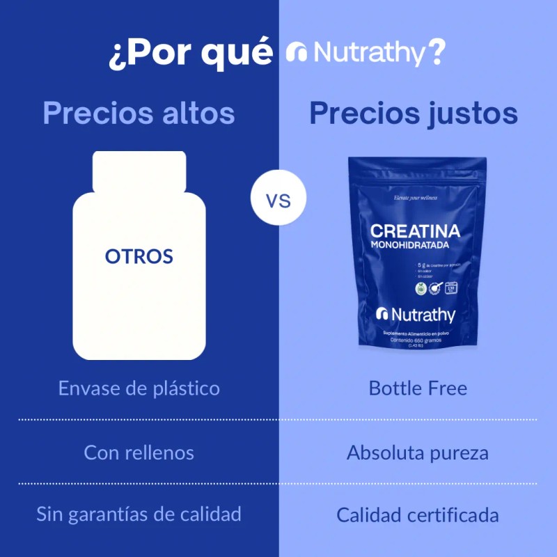 Aumenta tu fuerza, potencia y recuperación muscular con Creatina Monohidratada 100% pura de Nutrathy. Diseñada para deportistas exigentes, esta fórmula sin sabor, sin aditivos y sin rellenos te da el impulso que necesitas para alcanzar tu máximo nivel 💥⚡
