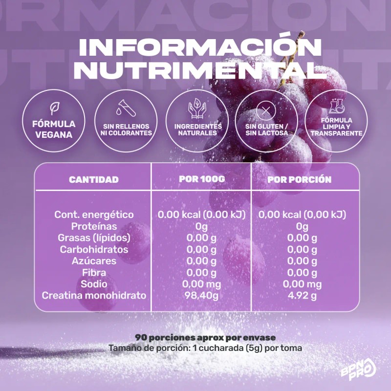 Creatina En Polvo Monohidratada Pura Sabor Uva BPN PRO 450g Potencia Entrenamientos, Resistencia y Masa Muscular 90 Servicios Recomendado Para...