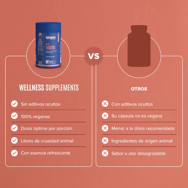 Comprometidos con la transparencia y sostenibilidad, Birdman ofrece un producto cruelty free, elaborado con ingredientes cuidadosamente seleccionados. Birdman Myo-Inositol refleja la dedicación a ofrecer suplementos que equilibran calidad, confianza y respeto por el medio ambiente.