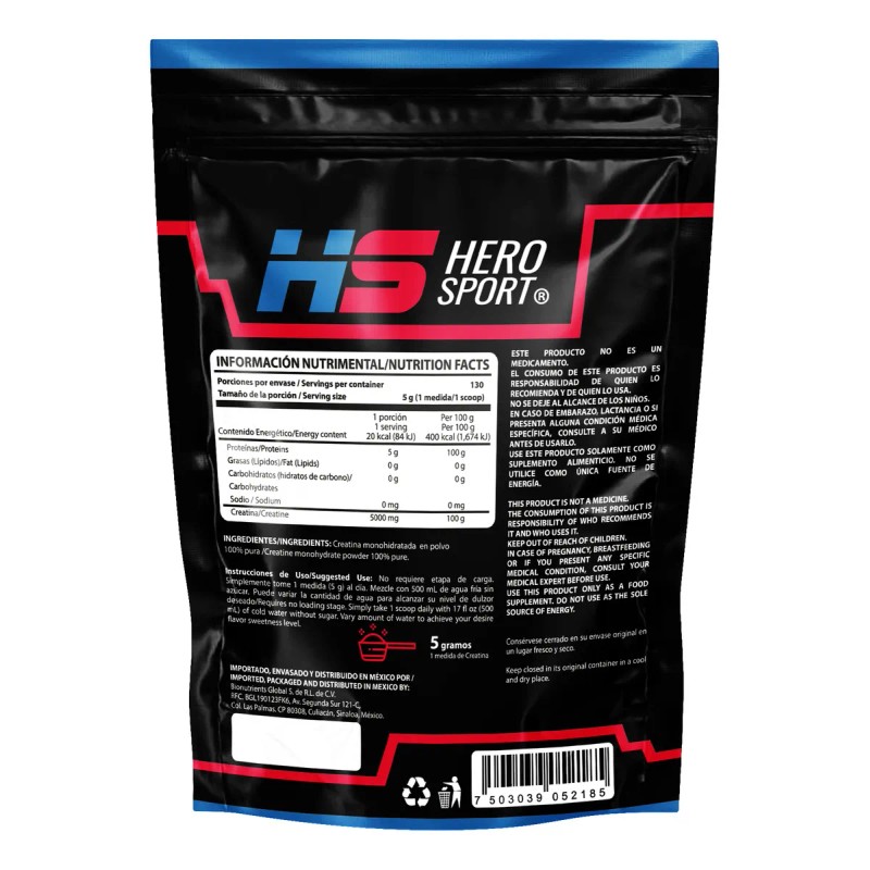 Creatina Monohidratada Hero Sport | 650g | 130 Servicios | Sin Sabor | Energía y Fuerza Máxima