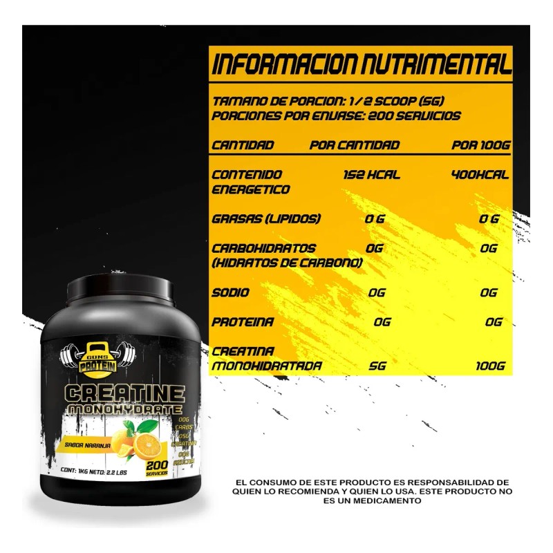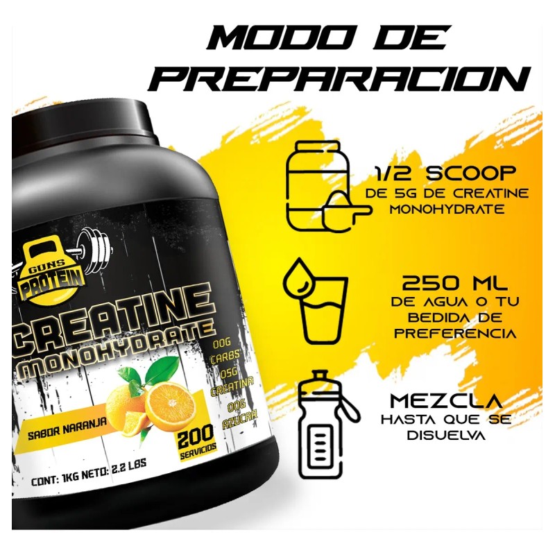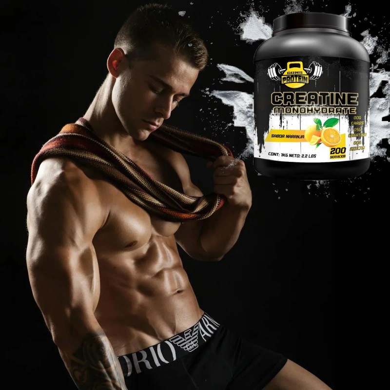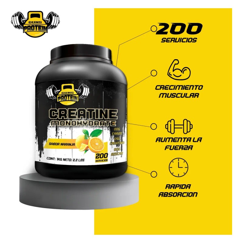 creatina monohidratada guns, creatina sabor naranja, creatina pura 200 servicios, suplemento para fuerza y volumen, creatina para gym, creatina para hombres y mujeres, creatina micronizada, creatina post entrenamiento, creatina guns 1kg