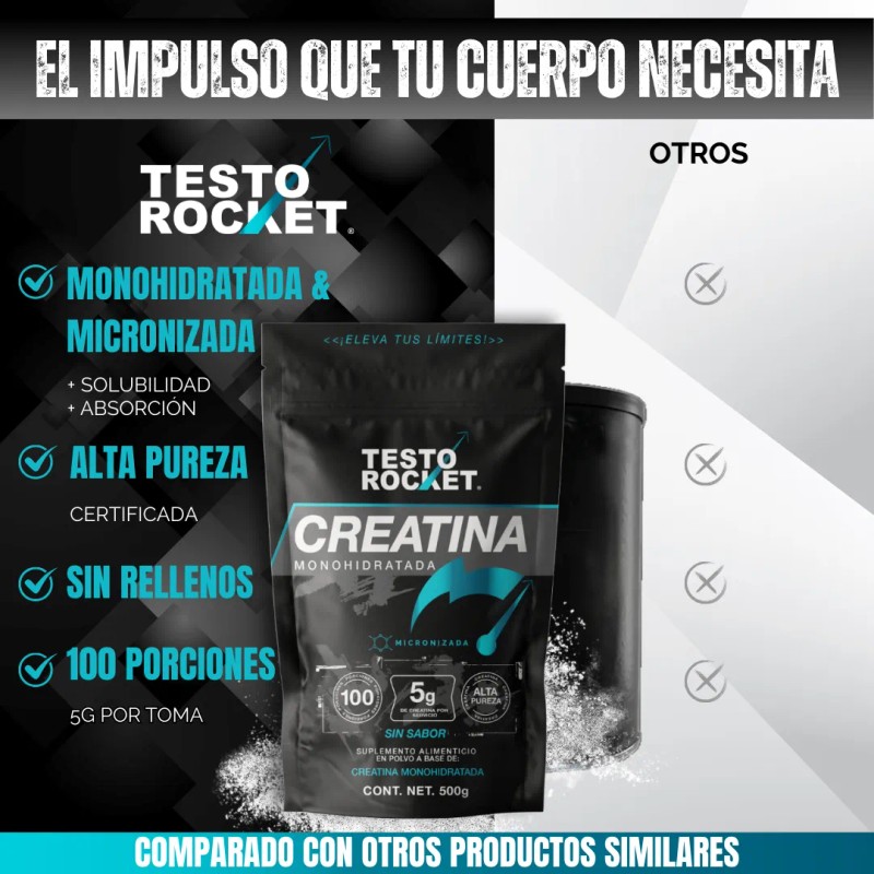 - Creatina Testo Rocket es un suplemento alimenticio de la más alta calidad que contiene Creatina Monohidratada Micronizada de Alta Pureza, formulado para apoyar el rendimiento físico, fuerza y recuperación muscular después de cada entrenamiento. Más calidad, Más cantidad y Menor precio: Cada envase de 500g rinde 100 porciones de 5 gramos cada una, sin sabor y sin aditivos innecesarios. Ideal para quienes buscan resultados reales: deportistas, personas activas o quienes siguen una dieta vegana/vegetariana. Beneficios clave