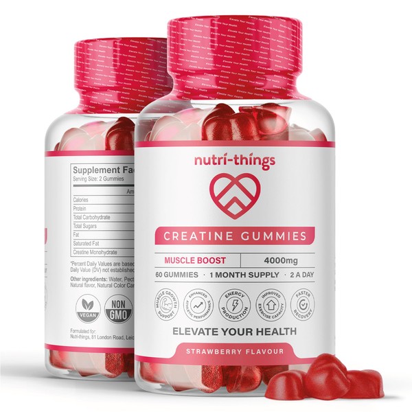- Unleash Your Potential: Introducing the Creatine Gummies from Nutri-things, part of our 'Elevate Your Health' product range. These gummies are specially formulated to support muscle growth, enhance athletic performance, and increase energy production. With a powerful dose of 4000mg of creatine in each serving, they're designed to improve your exercise capacity and aid in faster recovery.