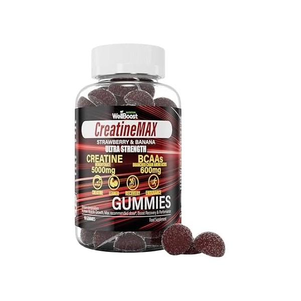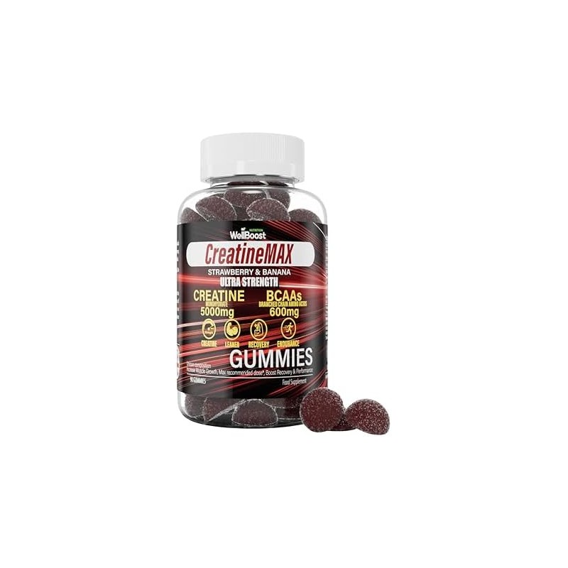 WellBoost Creatine MAX Gummies - 5000mg Creatine Monohydrate & 600mg BCAAs per Serving - Vegan, Sugar-Free Chewable Gummies with Strawberry & Banana Flavour - 90 Gummies (1 Month Supply)