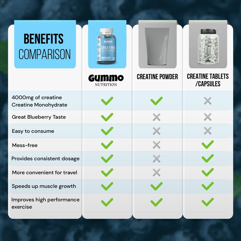 - GUMMO NUTRITION has developed these tasty Creatine Gummies for fitness enthusiasts, bodybuilders and both male and female athletes. Our chewable Creatine Gummies come in natural blueberry flavour and offer 60 Gummies per bottle for a 30 day supply. Take 2 Creatine Gummies per day for a 4000mg serving of Creatine Monohydrate.