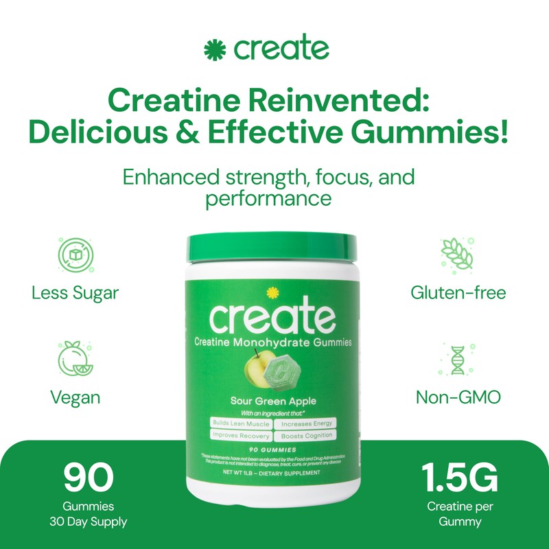 Creatine Monohydrate Gummies for Men & Women - Boost Focus, Strength, and Endurance, Anti-Melting Formula, Vegan, Gluten-Free, Non-GMO, 1.5 Gram Creatine per Gummy (Sour Green Apple, 90 ct)