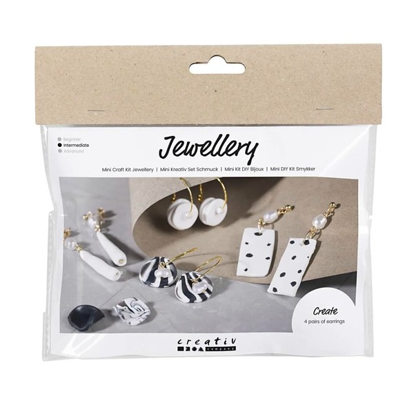 - If you are the type who loves eye-catching statement earrings, our jewellery set is for you. Here you can make the finest pendants for both hoop earrings and stud earrings made of fine clay polymer. The clay is soft, supple and very easy to work with. Experiment with fun shapes and patterns - and finally decorate with small white pearl beads. The result is real unique earrings that attract attention in the best possible way.