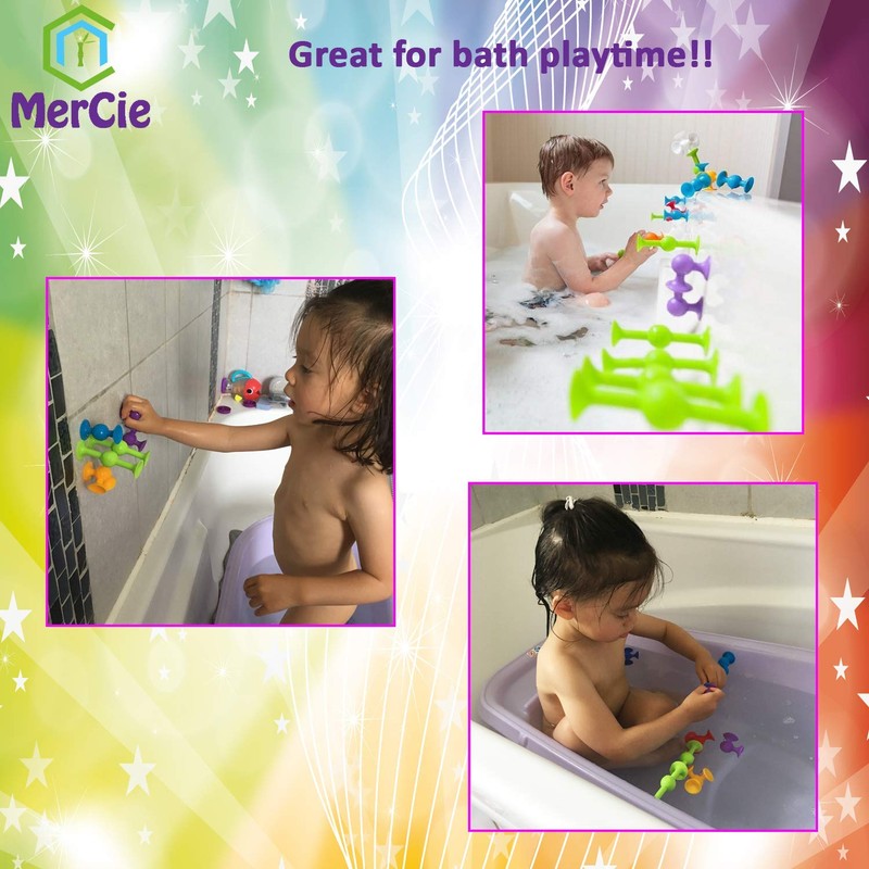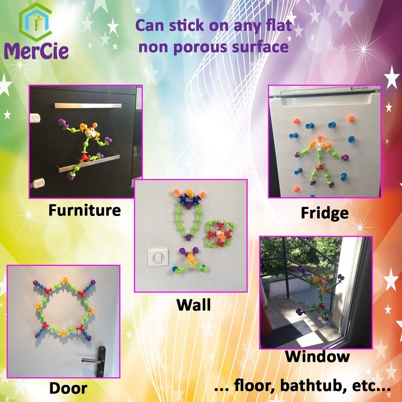- 【59 pieces】: The 59 suction cups in 10 different shapes allow you to create all kinds of shapes. Possibilities are endless. Suction cups can stick together on all smooth surfaces (tiles, mirrors, fridge, bathtub, door, wall, etc.) without leaving any residue. Due to the large quantity, several children can play together at the same time. Surely the toy will keep them away from TV and tablet screens.