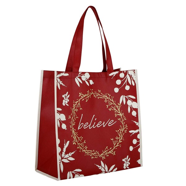 - VINTAGE CHRISTMAS STYLE: Christmas red tote with white floral sprays and a gold wreath; hand-lettered message reads "Believe"