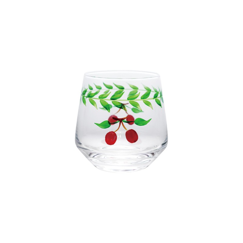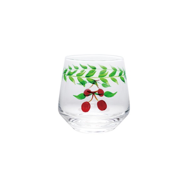 - A charming hand-painted drinking glass adorned with vibrant cherries in green and red