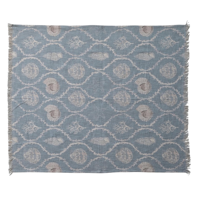 Creative Co-Op Cotton Slub Throw with Coral and Shells Ogee Pattern, Blue and Natural