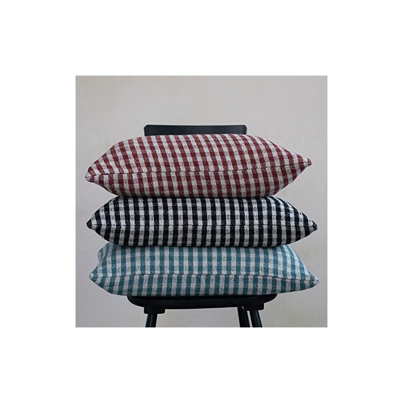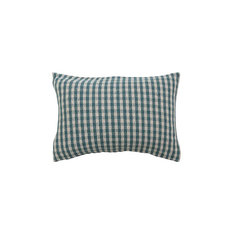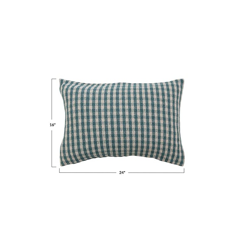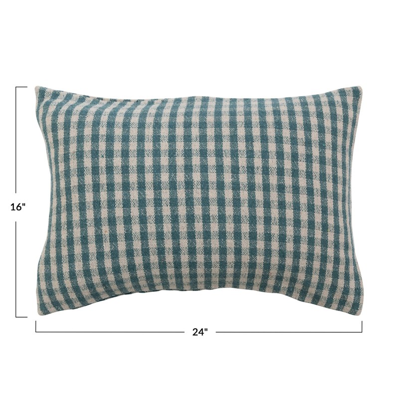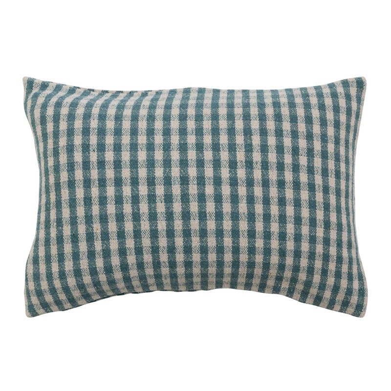 - Teal and white woven recycled cotton blend lumbar pillow with gingham print