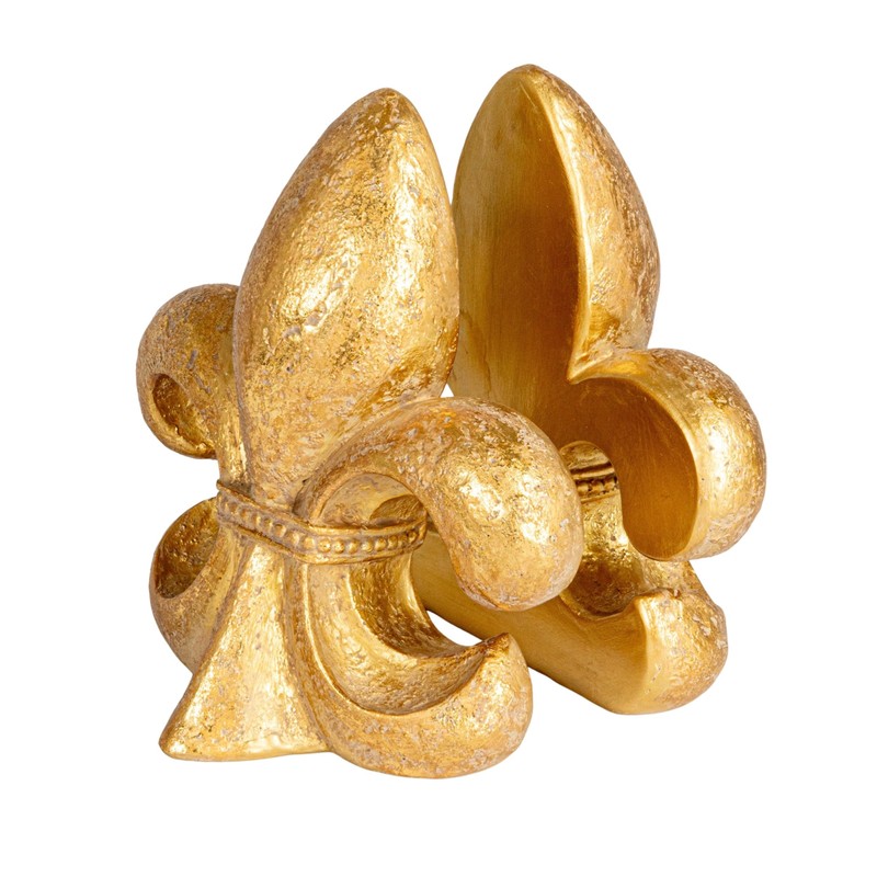 - A pair of golden bookends, each adorned with the classic Fleur de Lis symbol, offering a regal touch to any bookshelf