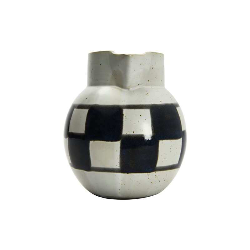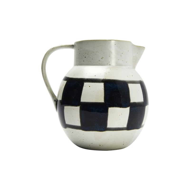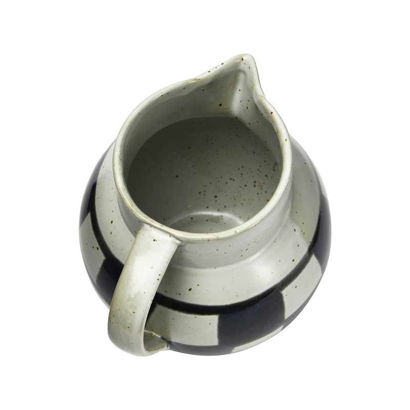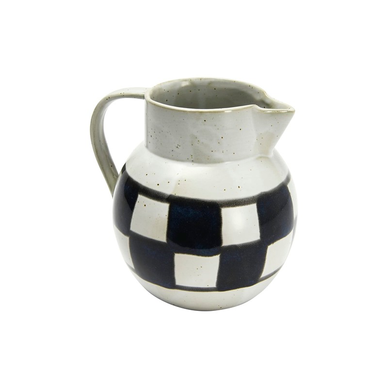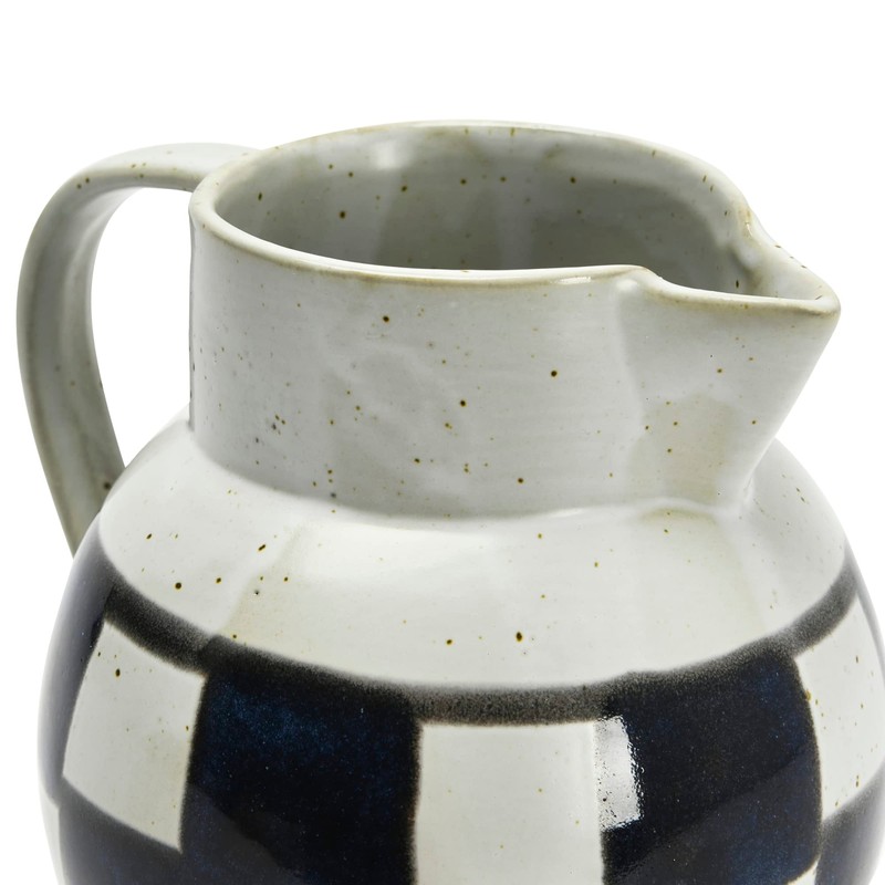 - This charming stoneware pitcher showcases an intricately hand-painted checker design and a naturally variating reactive glaze