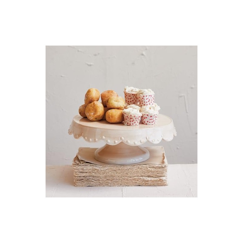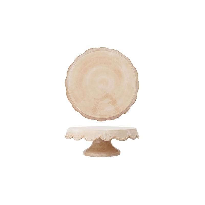 - A hand-painted stoneware pedestal with a scalloped edge and embossed dots, in a chic nude color