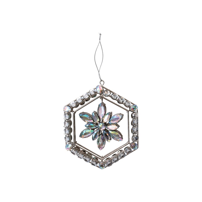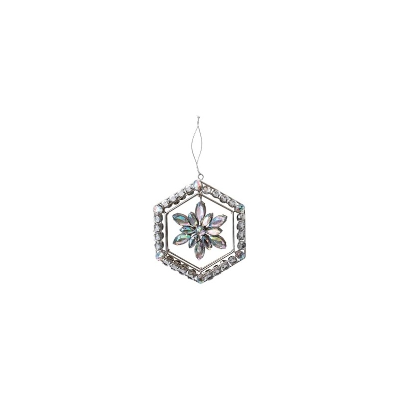 - A snowflake ornament, featuring a hexagon frame with acrylic jewels, all in a stunning silver finish