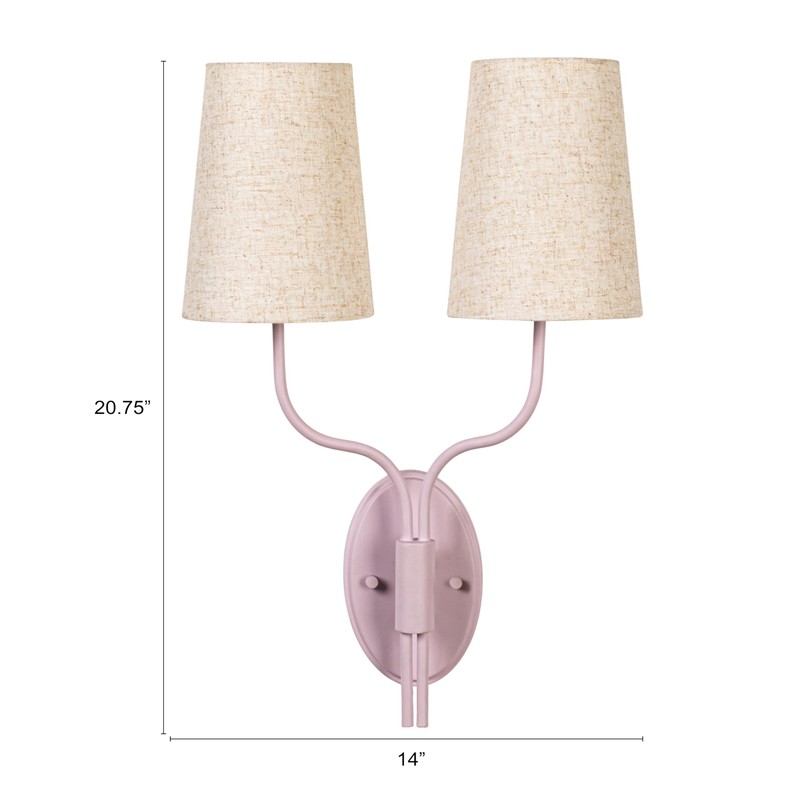 - A charming metal double wall sconce with a lavender powder-coated finish and two linen shades