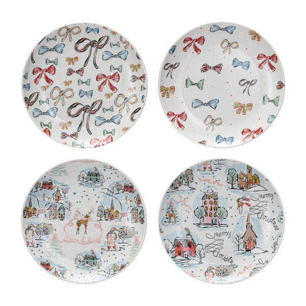 Creative Co-Op Round Stoneware Plate with Holiday Pattern, Multicolor, Set of 4