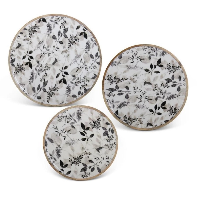 Creative Co-Op Set of 3 Wooden Enamel Plates with Black & Gray Botanical Florals