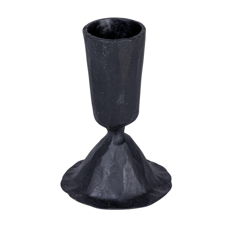 - A tall, hand-forged taper holder in a classic black finish, exuding industrial charm