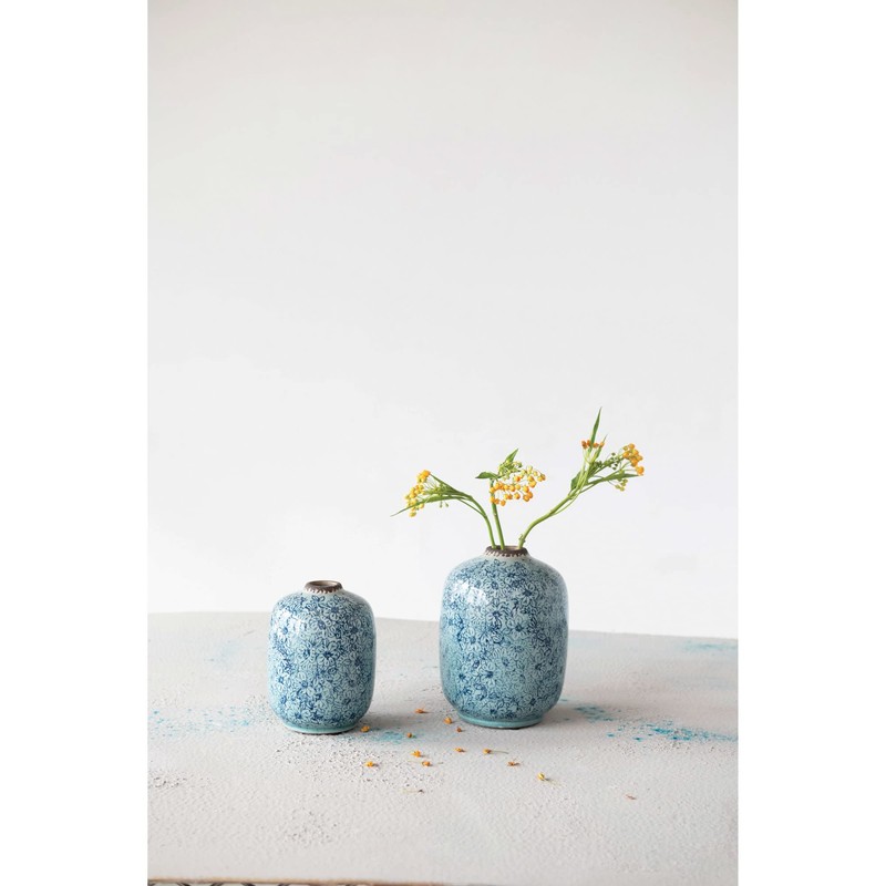 Creative Co-Op Terra-Cotta Floral Pattern, Distressed Blue Vase, 5" L x 5" W x 7" H