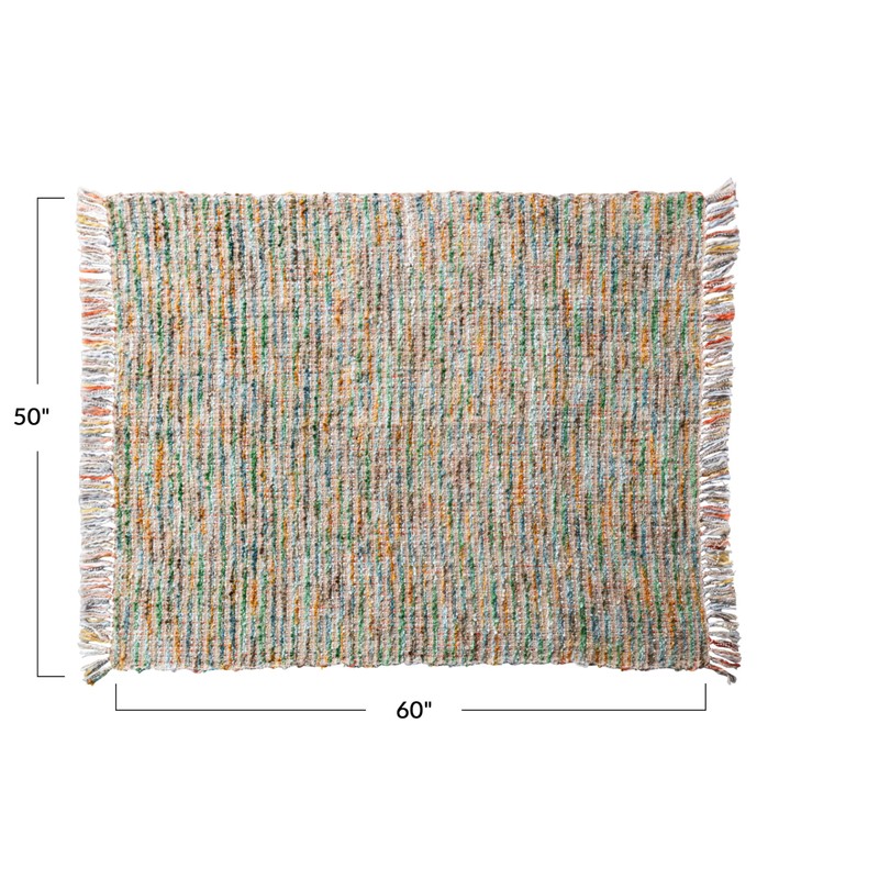- A soft and cozy throw blanket with a multi-colored woven acrylic bouclé fabric and fringe details