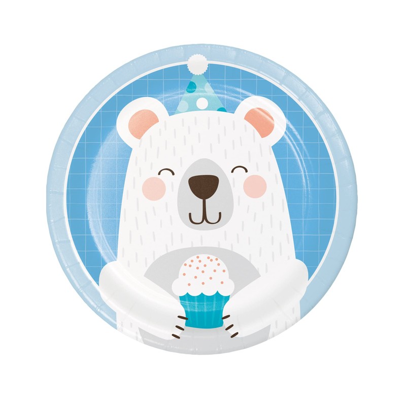 Break out the cake with the Bear party dessert Plates. The sturdy style plates are made of paper and measure 7” round. Each plate features a Blue, cubed background and a light Blue border. In the center is a smiling polar Bear that is wearing a party hat and holding a cupcake. The premium strength paper plate comes in packs of 8 and can be combined with other Bear party supplies.