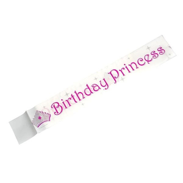 - This sash features a pink "Birthday Princess" headline with a princess crown on both sides