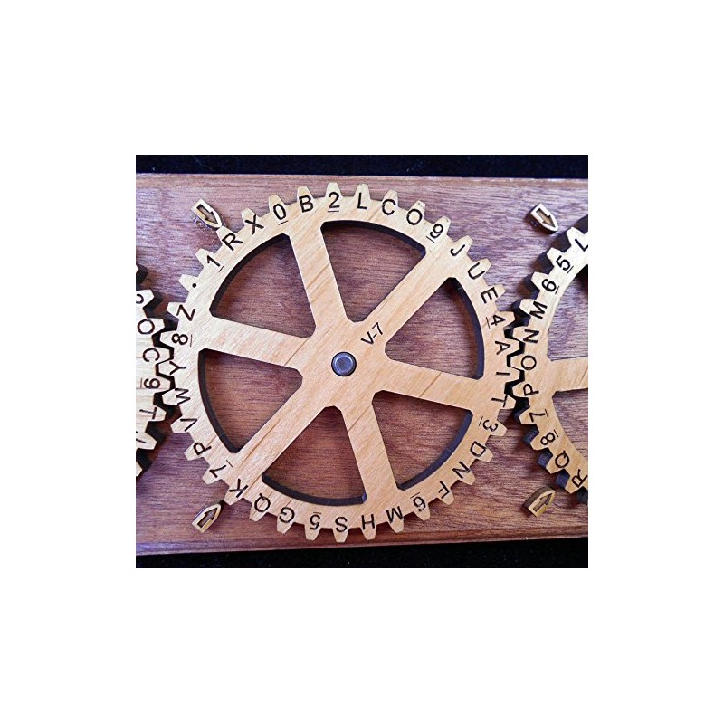 • 5 double sided gears can provide 266 billion different possible keys. Each gear has 37 teeth containing the English alphabet, the digits 0 thru 9 and a decimal point (or period). The machine is relatively easy to use to encode your own highly encrypted secret messages! Send and receive secret messages to anyone who has a machine. We provide an encryption worksheet with your order that is also available electronically and can be useful in encoding and decoding messages. Hardwood construction with gears cut from ¼” thick wood. All letters and text are deeply laser engraved into the wood. The gears turn on alloy steel pins. Each gear is 4" in diameter. Base measures about 21" x 4.5". Creative Crafthouse Made in USA Please watch video for more details on how to use the machine.