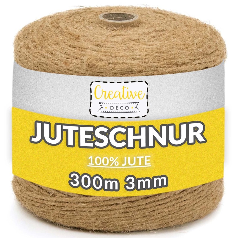 • Large size – with 3-ply twine and 985 feet length (300 m) / 2-3 mm Creative Deco jute yarn is very long and thick enough to give high strength. Our decorative cord is soft but much more durable than traditional strings. Packed in the shape of a spool, it does not tangle and you can cut it to any length.