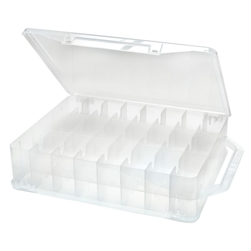Perfect for storing spools (up to 3 by 1-1/2-inch in size); floss; bobbins; and small embellishments. The organizer has two hinged doors so access is easy from either side and also features 46 fixed compartments; a carry handle for portability; and is made of transparent; durable molded plastic. This organizer measures 14 by 10-1/2 by 3-inch. Made in USA.