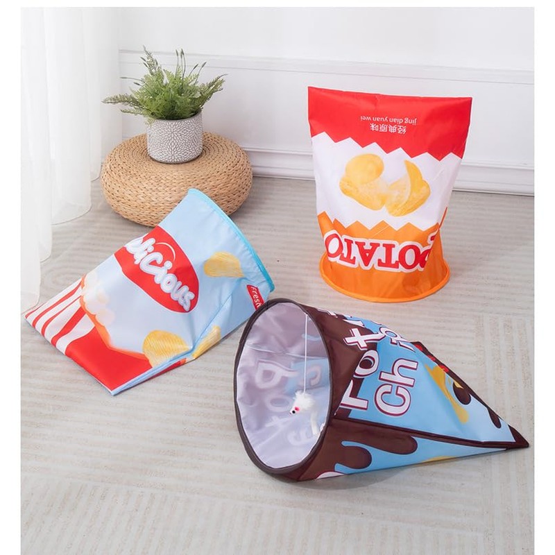 This product is inspired by the cat's love of drilling paper bags. The creative potato chip bag with small toys provides a fun and safe environment for cats. The sound paper bag design makes them fall in love with this nest, and keeps pets away from depression when they are not accompanied by their owners