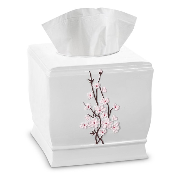 Creative Scents Vanda Tissue Box Cover Square - Cherry Blossom Decor White and Pink Floral Tissue Holder for Bathroom - Decorative Tissue Box Holder with Durable Bottom Slider for Tissues Cube Boxes