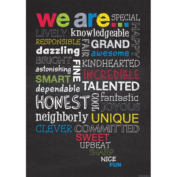 "We are special, lively, knowledgeable, happy, responsible, fair, grand, dazzling, awesome, bright, kindhearted, astonishing, find, incredible, smart, dependable, talented, honest, cool, fantastic, joyous, neighborly, unique, clever, committed, sweet, upbeat, sharp, nice, fun "Inspire your students with the powerful message on this beautifully designed and trendy chalkboard-themed poster!