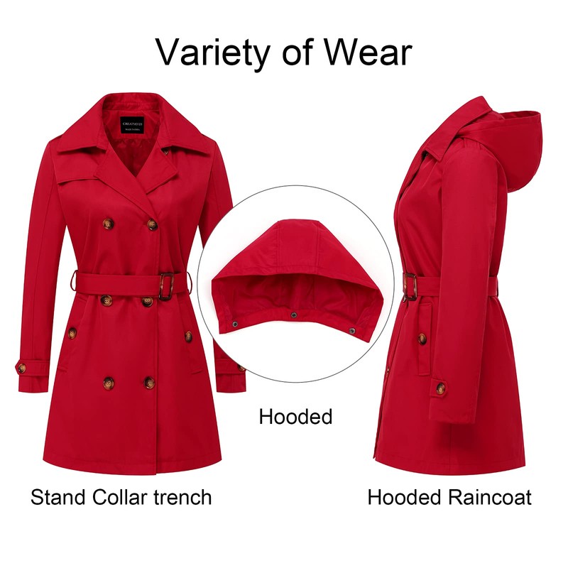 CREATMO US Womens Trench Coat Petite Waterproof Dress Coat With Hood Red XS