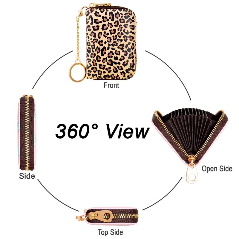 Credit Card Holder for Women, RFID Card Holder Wallet - Slim Leather Zipper Card Case - Ladies Small Keychain Wallets (Classic Leopard Print)