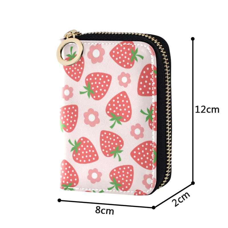 Credit Card Holder Wallet for Women RFID Blocking Zipper Card Cases Strawberry Cute Pink Leather Slim Small