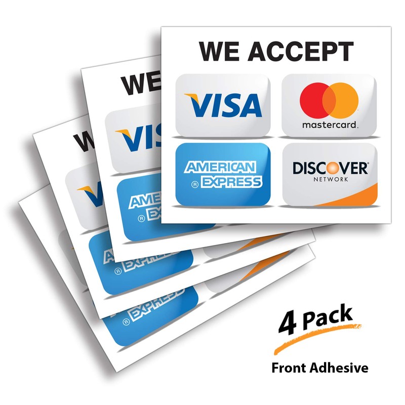 Credit Card Sticker Signs Stickers â 4 Pack 7âx 6â Inch - We Accept Visa, MasterCard, Amex & Discover, Premium Front Adhesive Vinyl to Apply Inside The Window or Glass Door for Stores Business