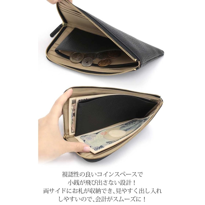 This item is made of Italy leather that gives you a soft texture and expressive texture. The slim form and simple design are also attractive. The L-shaped zipper opens wide and allows access to the interior in one action.
