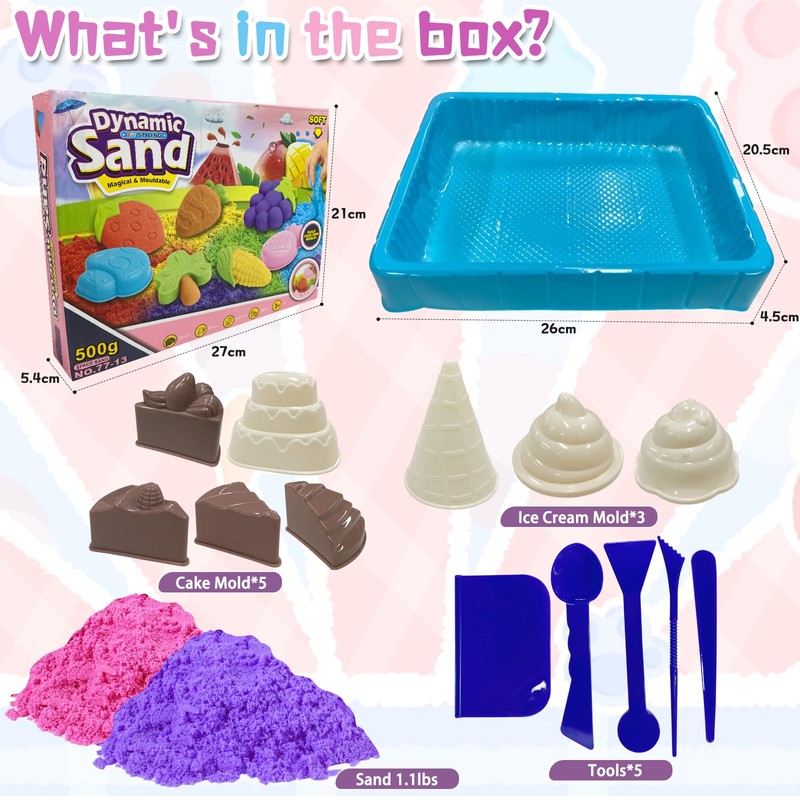 - 🍰The Ice Cream and Cake Sand Kit is a delightful playtime experience that combines the fun of sand with the creativity of dessert-making. This set includes 1.1lbs vibrant, moldable magical sand in various colors, allowing children to sculpt their own ice cream cones and delicious cakes.