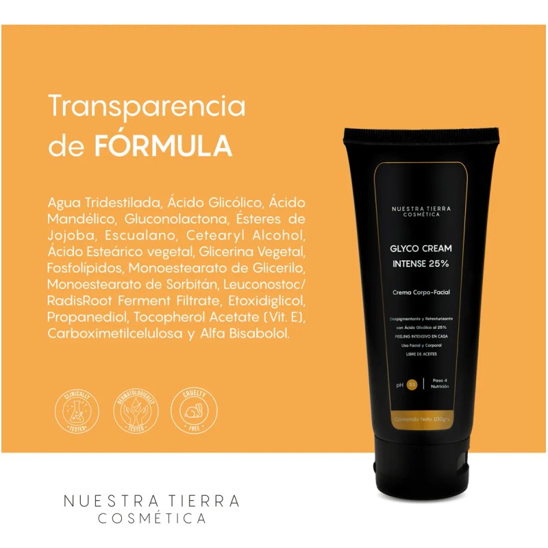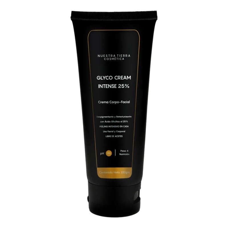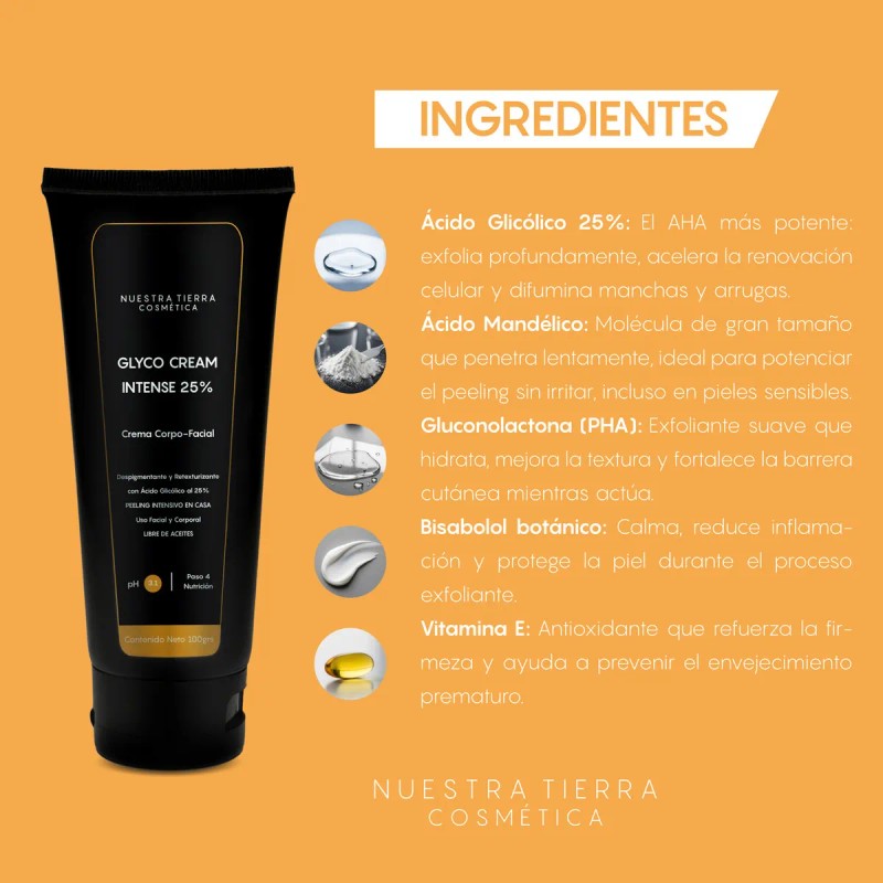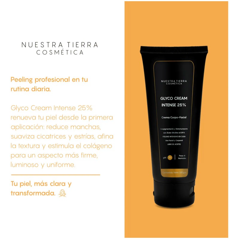 • Incluye: 1 Crema Intensiva Ácido Glicólico 25% Peeling de 100grs REGALO: 1 Sun Care Sensible 20ml Una crema que brinda un peeling intensivo en casa diseñada para proporcionarte una piel más radiante, uniforme, lisa, firme y luminosa (Glow Skin). Transforma tu piel con esta fórmula avanzada que combina ácido glicólico al 25%, ácido mandélico, gluconolactona y bisabolol. El ácido glicólico al 25% promueve una renovación celular acelerada que reduce eficazmente las manchas oscuras, las zonas con hiperpigmentaciones, atenúa estrías, mejora la textura de la piel, dejándola más suave, uniforme y radiante, mientras que el ácido mandélico y la gluconolactona actúan suavemente para unificar el tono, mejorar la textura, reducir las arrugas y mejorar la hidratación. GLYCO CREAM INTENSE tiene un pH que brinda un perfecto equilibrio entre la eficacia del tratamiento y la tolerancia de la piel. Además, está adicionada con bisabolol, un ingrediente que calma la piel y reduce la inflamación, asegurando que tu piel se mantenga hidratada y confortable durante el tratamiento. Ideal para quienes buscan una transformación visible, pues deja tu piel radiante, uniforme y rejuvenecida. Su sensorial es suave y exquisito, no es pesada ni molesta, ya que está libre de aceites, haciéndola compatible con todo tipo de pieles. Se puede aplicar en rostro y cuerpo. Presentación: Frasco con 100grs Beneficios: